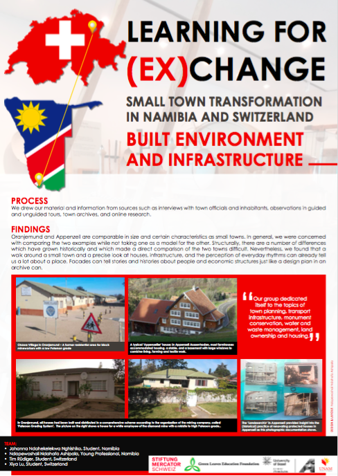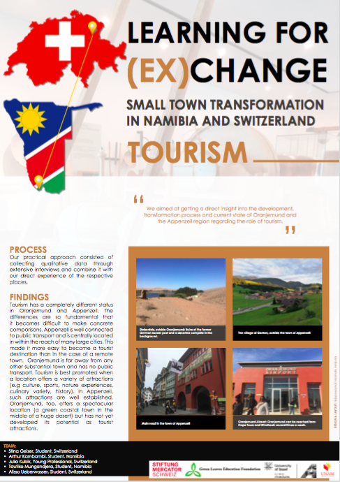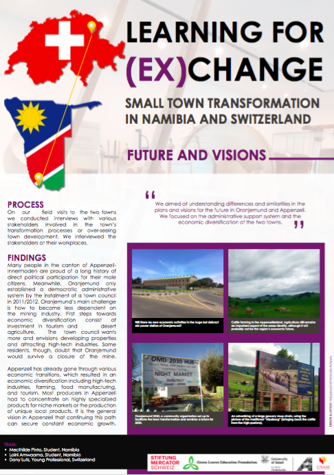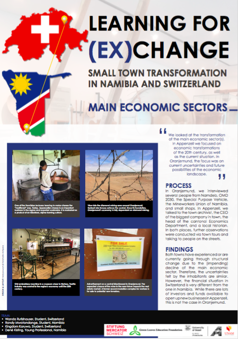 The first Summer / Winter School took place in Oranjemund, Namibia and in Appenzell and Herisau, Switzerland. Nine students and three young professionals from Namibia worked together with seven students and two young professionals from Switzerland. The students and lecturers covered a wide range of academic disciplines. This provided a unique and diverse platform and turned the exchange programme into a highly interdisciplinary project. The entire group spent four weeks together – two in each country. During this time, they had to work in small groups to observe, collect material and information and talk to relevant people to find out more about their specific topics in the two contexts. The results of the students’ observations can be found here: